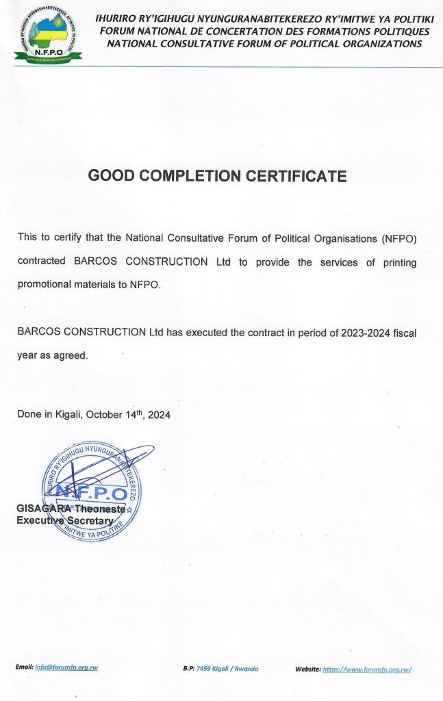 Barcos Construction is proud of getting a good completion certificate from The National Forum of Political Organs ( NFPO) ! we worked together in whole fiscal year of 2023-2024. This marks our credibility and good cooperation of the company and her customers. we encourage you to trust and work with Barcos.
